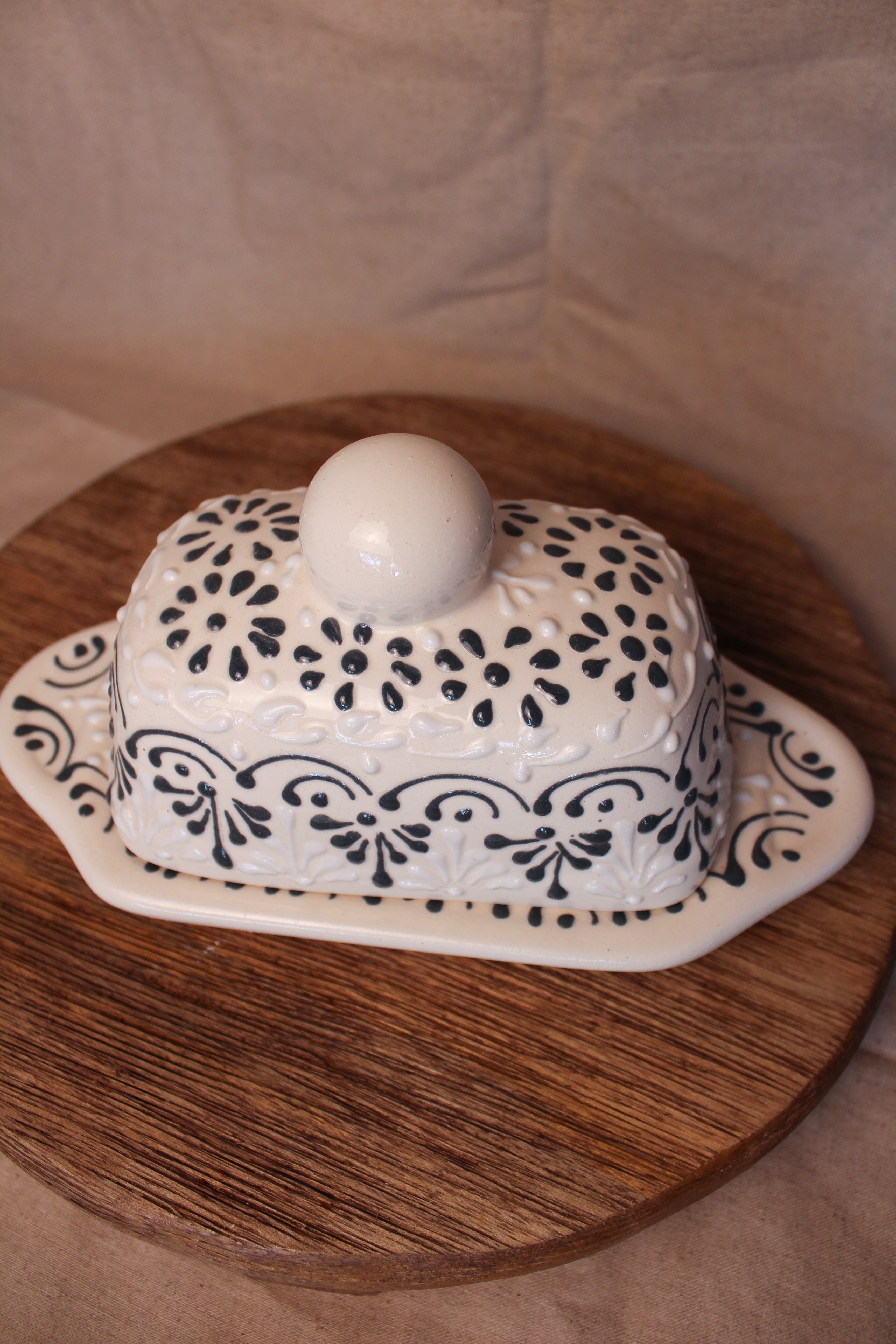 This butter dish will sit beautifully on your counter! Its a beautiful statement piece that will have you wanting to serve bread just as an excuse to bring it out onto the dinner table!